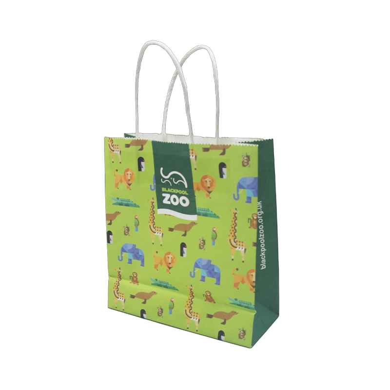 Túi giấy quà tặng di động này có màu nền xanh lá cây tươi tắn, với các họa tiết động vật hoạt hình vui nhộn được in trên đó. Nó bao gồm các hình ảnh vườn thú cổ điển như hươu cao cổ, sư tử, voi và chim cánh cụt. Khu vực trung tâm được tùy chỉnh với logo thương hiệu "BLACKPOOL ZOO", tạo ra bầu không khí sống động và vui tươi đồng thời mang lại cảm giác kỷ niệm.