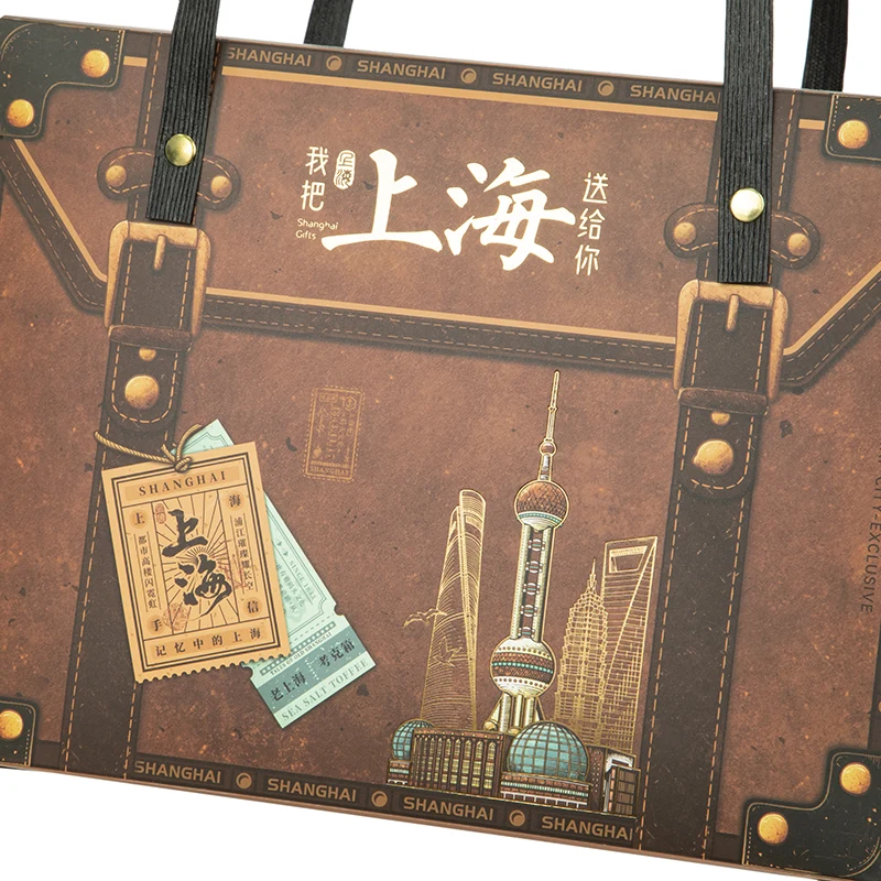 Bề mặt hộp in dòng chữ độc quyền như "Tôi trao Thượng Hải cho bạn", cùng với các yếu tố cổ điển như vé tàu và nhãn cũ. Nó có những thuộc tính văn hóa đô thị riêng. Nó không chỉ là bao bì mà còn là một món quà lưu niệm sưu tầm của thành phố. Nó thích hợp làm hộp quà tặng độc quyền cho các đặc sản địa phương và sản phẩm văn hóa ở Thượng Hải, truyền tải văn hóa khu vực.