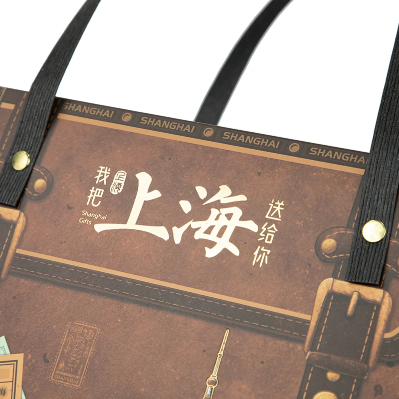 Hộp Giấy Quà Tặng Gửi Thư mô phỏng hình dáng của một chiếc vali kiểu cũ. Nó sử dụng màu cơ bản là nâu lâu đời và có đinh tán và khóa thắt lưng giả da, cùng với các họa tiết chạm nổi bằng vàng của các địa danh thành phố như Tháp Ngọc Phương Đông và các con phố cổ của Thượng Hải. Nhìn thoáng qua, nó gợi lên những ký ức hoài niệm về Thượng Hải xưa, khiến nó nổi bật giữa những hộp quà thông thường. Dù để làm quà tặng hay để trưng bày, nó đều có một điểm ghi nhớ sâu sắc.